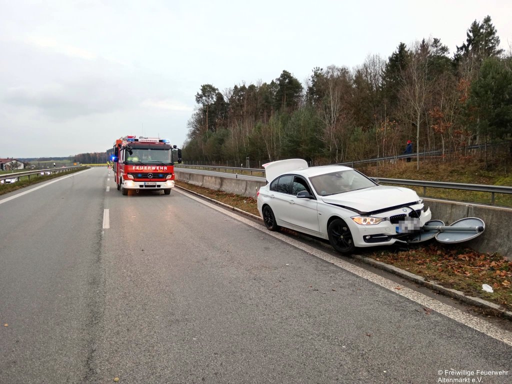 In Fahrtrichtung Untertraubenbach ist ein PKW in die Fahrbahnbegrenzung gekracht, eine Person ist verletzt.