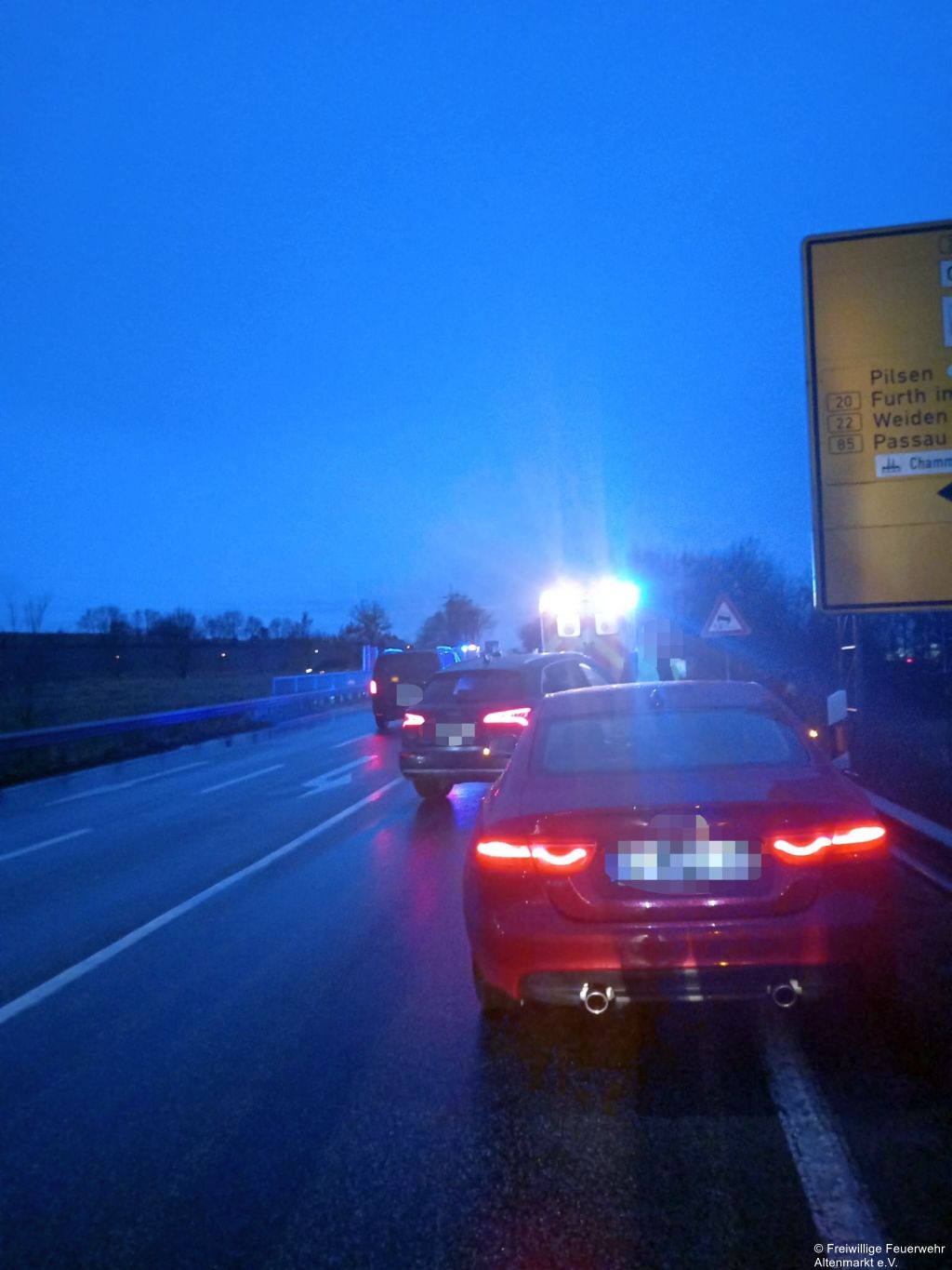An der Einsatzstelle ist es zu einem Auffahrunfall gekommen. Die Unfallstelle wird abgesichert und der Verkehr geregelt. Zwei Personen werden vom Rettungsdienst BRK Cham versorgt.